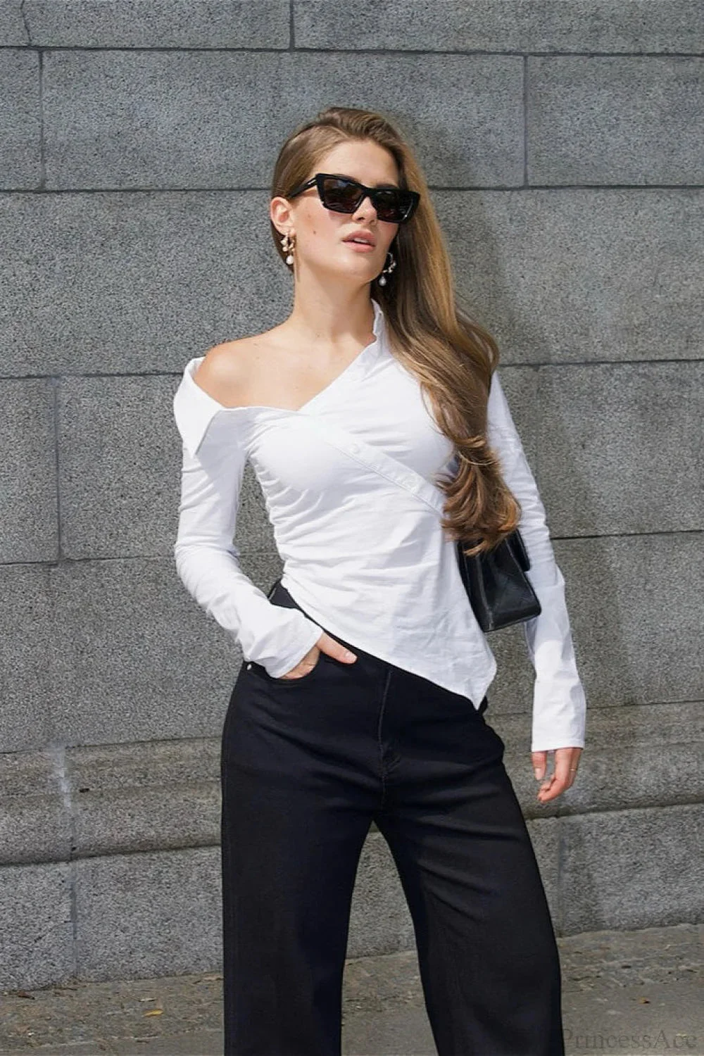 Asymmetrical Off-Shoulder Button Slim Long Sleeve Tee