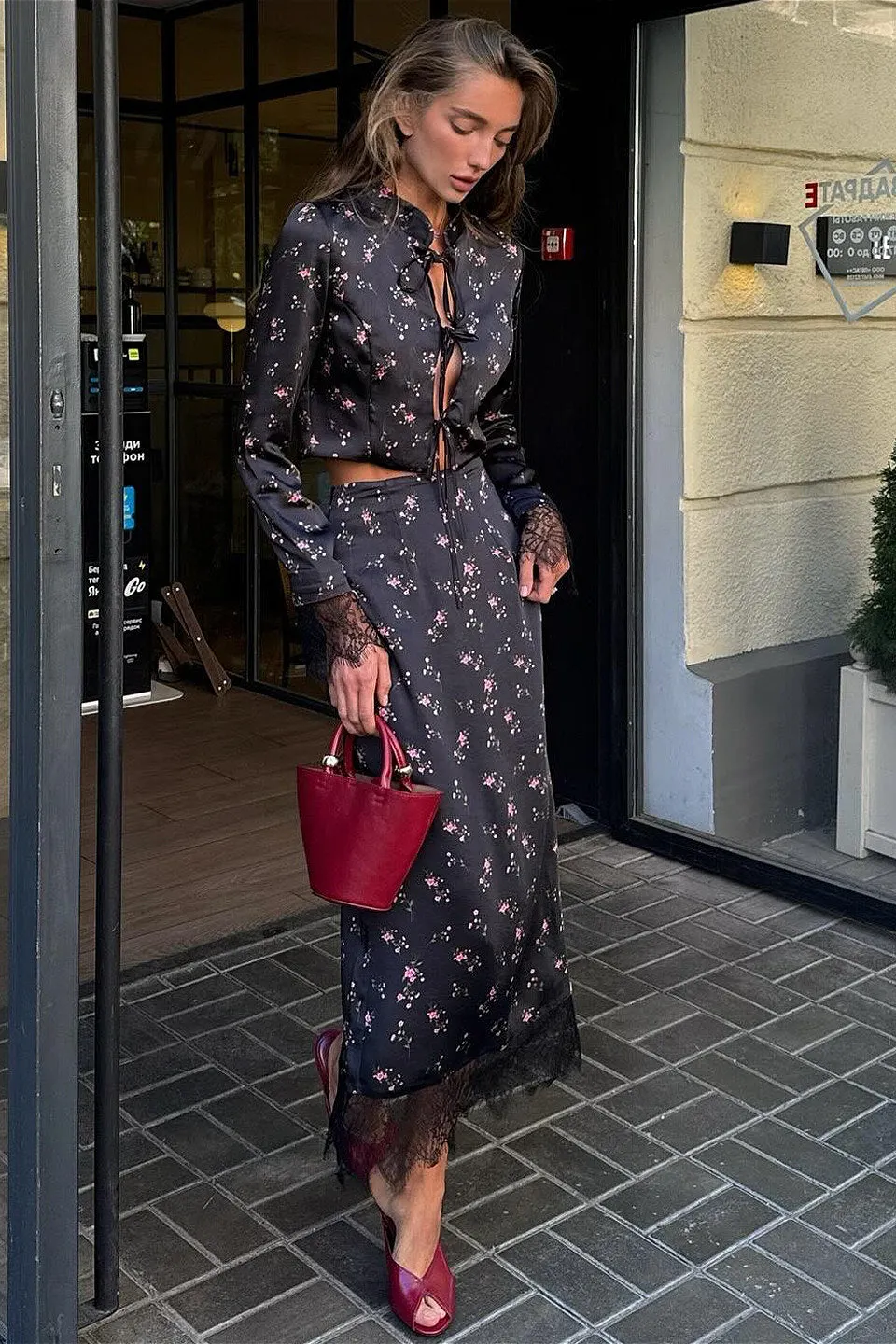Floral Tie Waist Crop Top Split Bodycon Skirt Two Piece Set