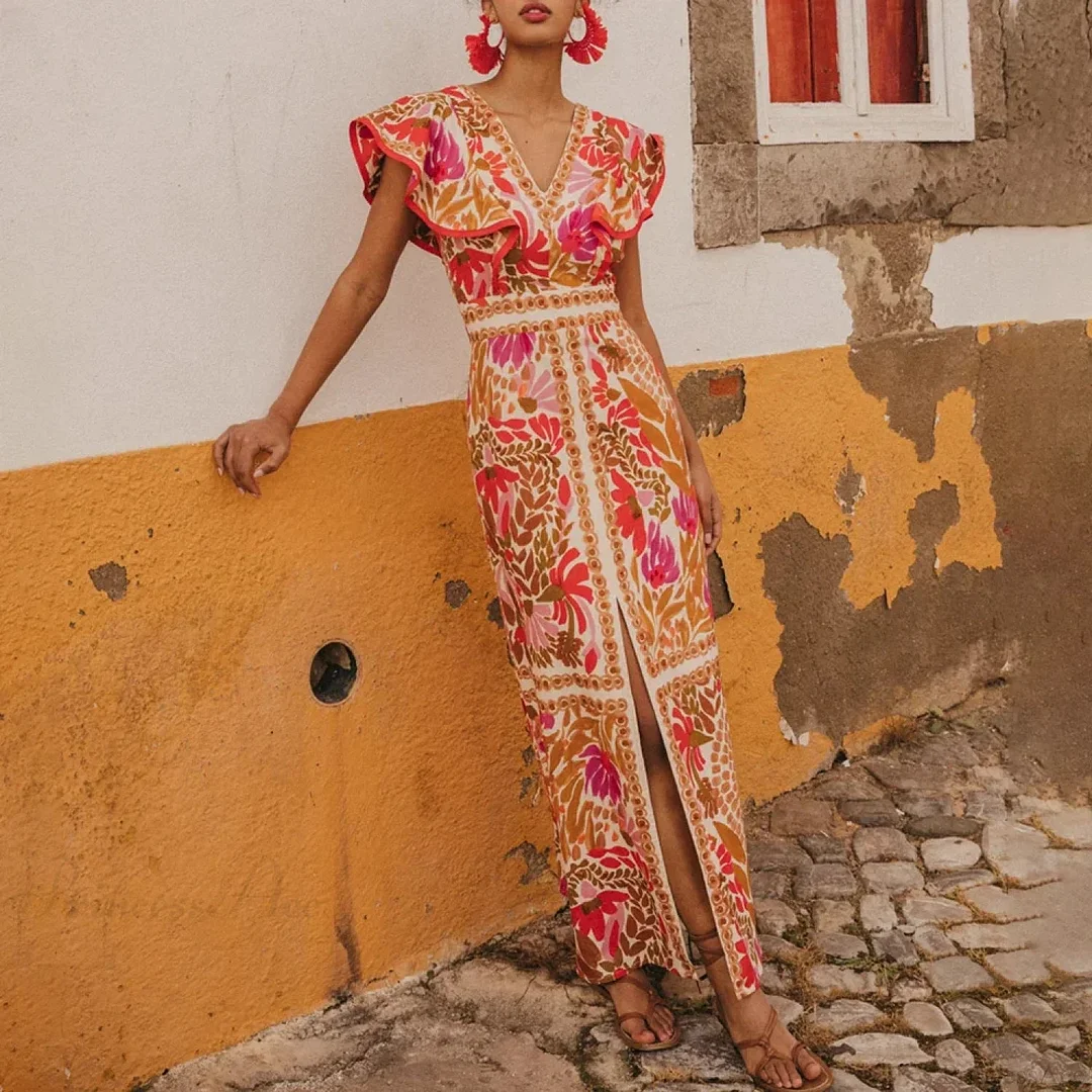 V Neck Retro Print Skirt Two Piece Set